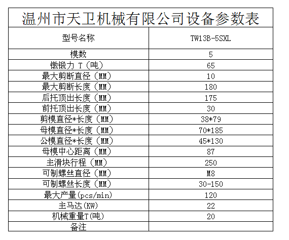 Current location:Home  / Products  / Five die five punch multi station cold heading machine  / └ TW13B(M8) / TW13B-5SXL fully automatic multi station cold heading machine
